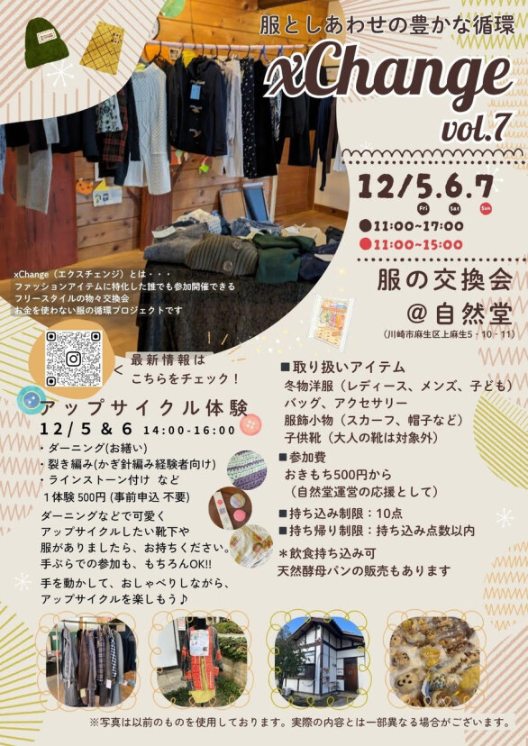 - 【アップサイクル体験コーナー】も開催!! ・日時:12月5(金) &6 (土) 14時〜16時 ・内容:ダーニング(お繕い)、裂き編み(かぎ針編み経験者向け)、ラインストーン付けなどの簡単な体験 ・参加費:1体験 500円 (申し込み不要) ※ダーニングなどでかわいくアップサイクルしたい靴下、服などがありましたら、お持ちください。手ぶらでも体験頂けます。 【飲食持ち込み可】 自家製天然酵母パンの販売もあります。 【最新情報】 最新情報を随時お知らせしていますので、ぜひご覧ください。 ◎オープンチャット「xChange〜服の交換会」 http://tiny.cc/4chcvz ◎インスタ https://www.instagram.com/jinendo.xchange/